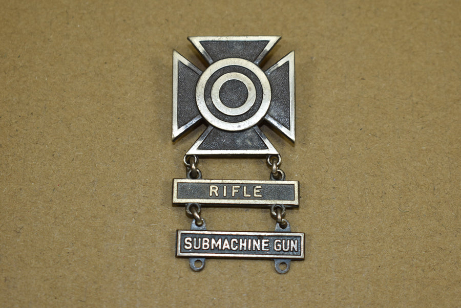 Sharpshooter qualification badge with Rifle and Submachine Gun bars. Sterling marked.