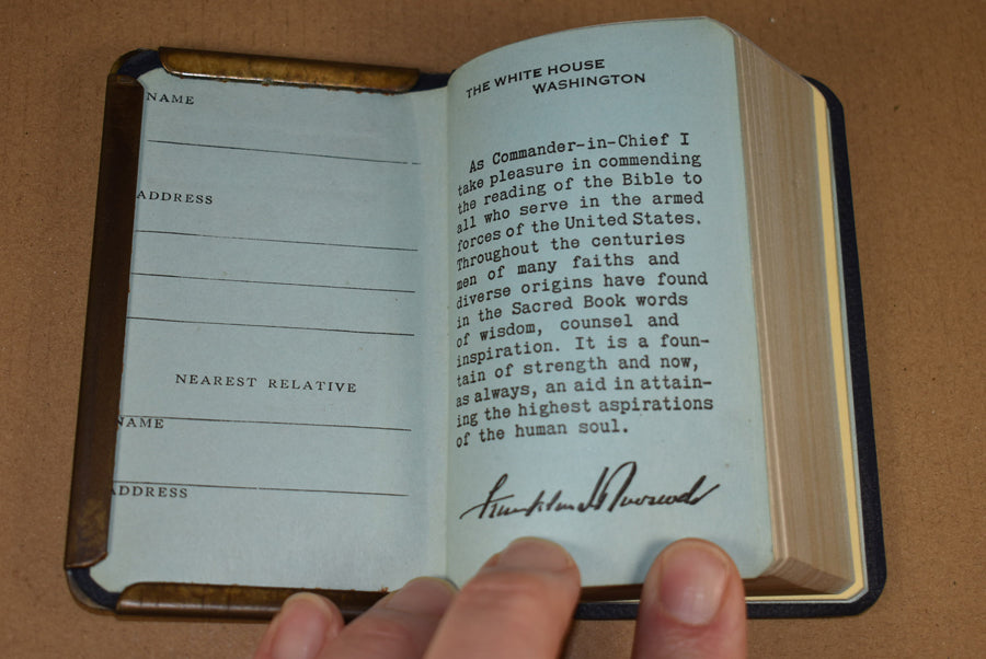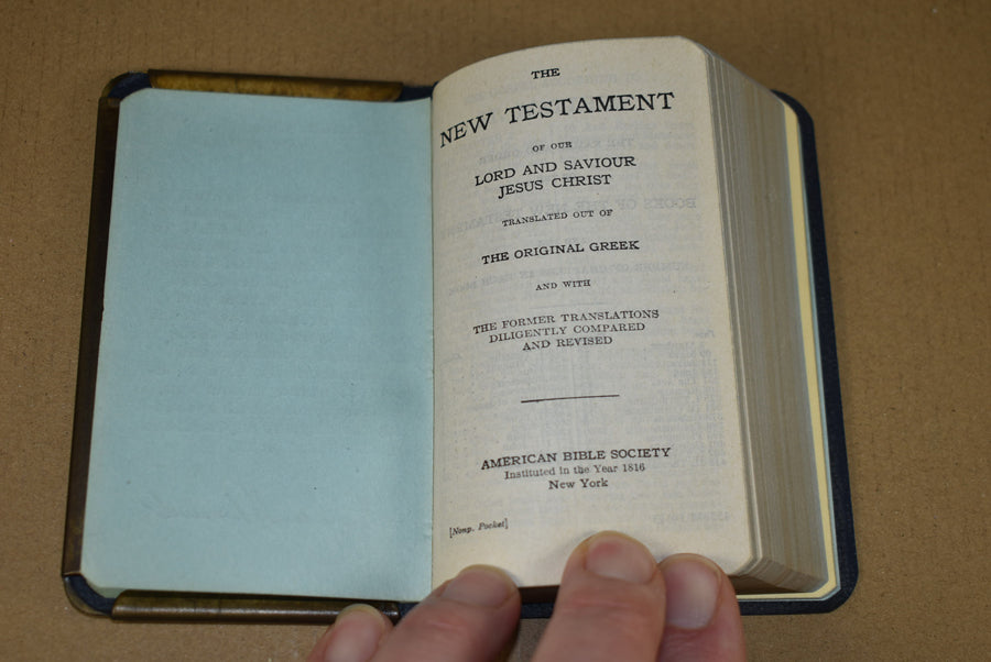 Heart shield bible. New testament with protective gold plated steel cover. 1943 dated. The cover is engraved with 'May this keep you from harm'. This is a super nice example as usually these steel covers have corrosion and loss of the gold plating.