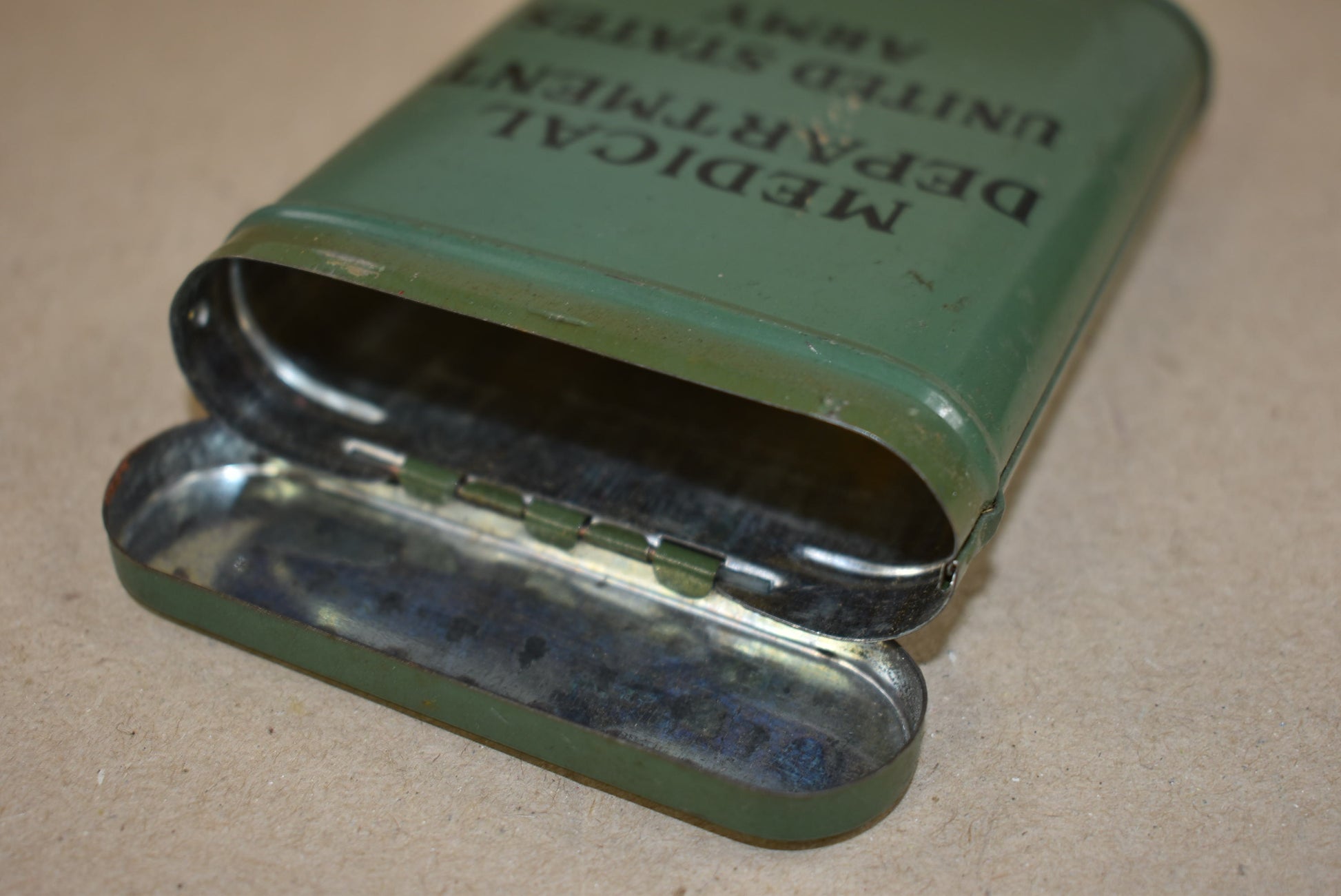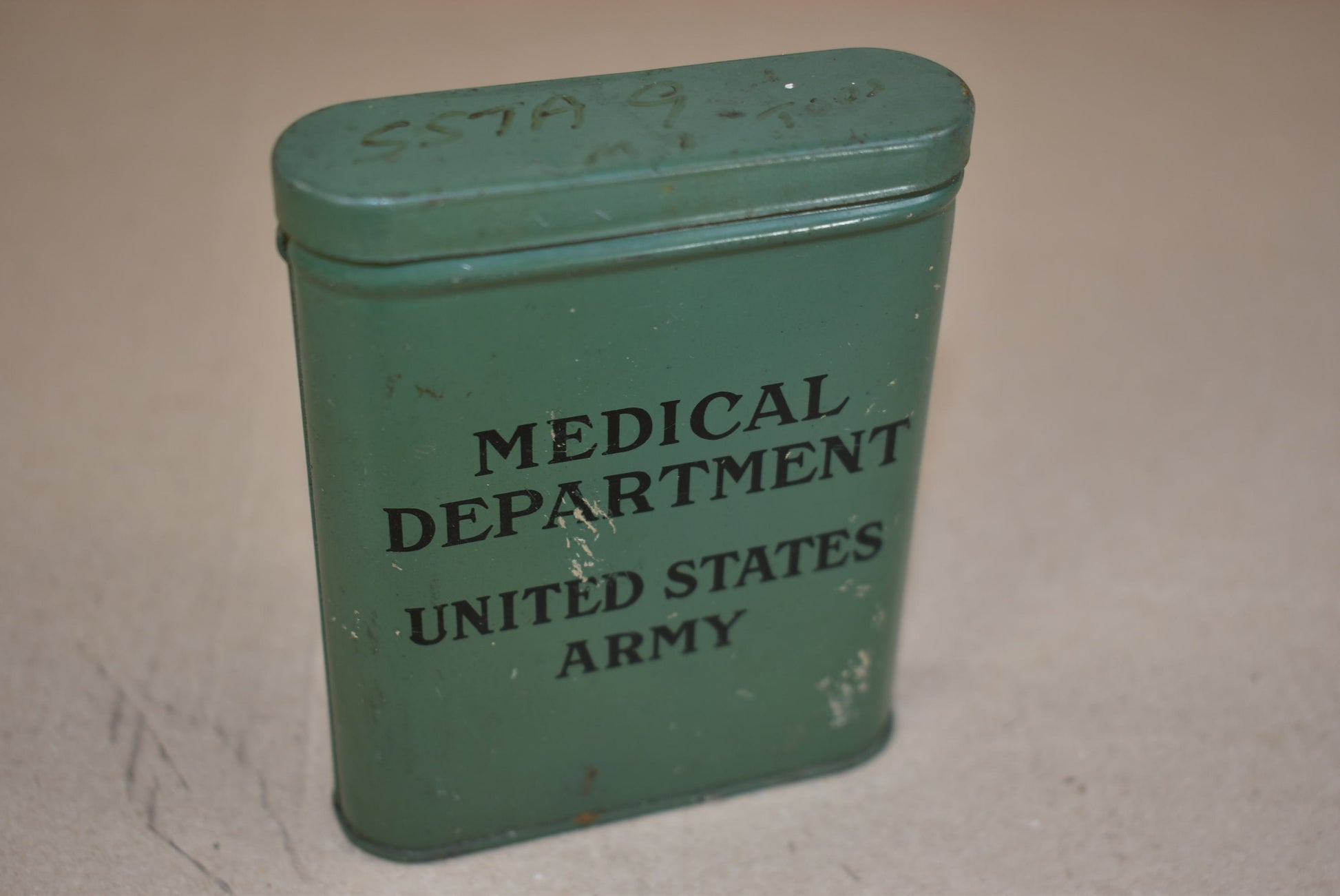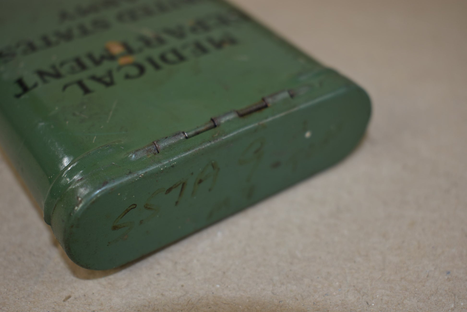 Medical Department OD green can with hinged lid to hold small medical items like Iodine swabs. This was carried in one of the inserts of the medic pouch. Also great to keep your smokes dry. Something was written on the lid, this can probably be removed if desired.