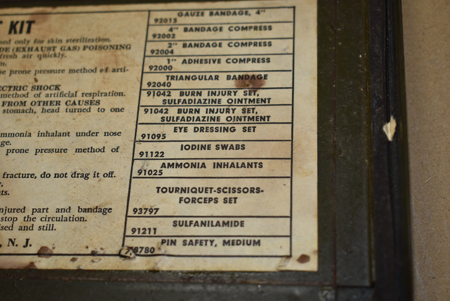 First Aid can, 12 units, Motor Vehicle, USMC. This is the rare first version with Red Cross on the lid and piano hinge. Produced by Davis Emergency Equipment Co. Inc. The rubber in the lid is still present and in good shape. The box closes well.