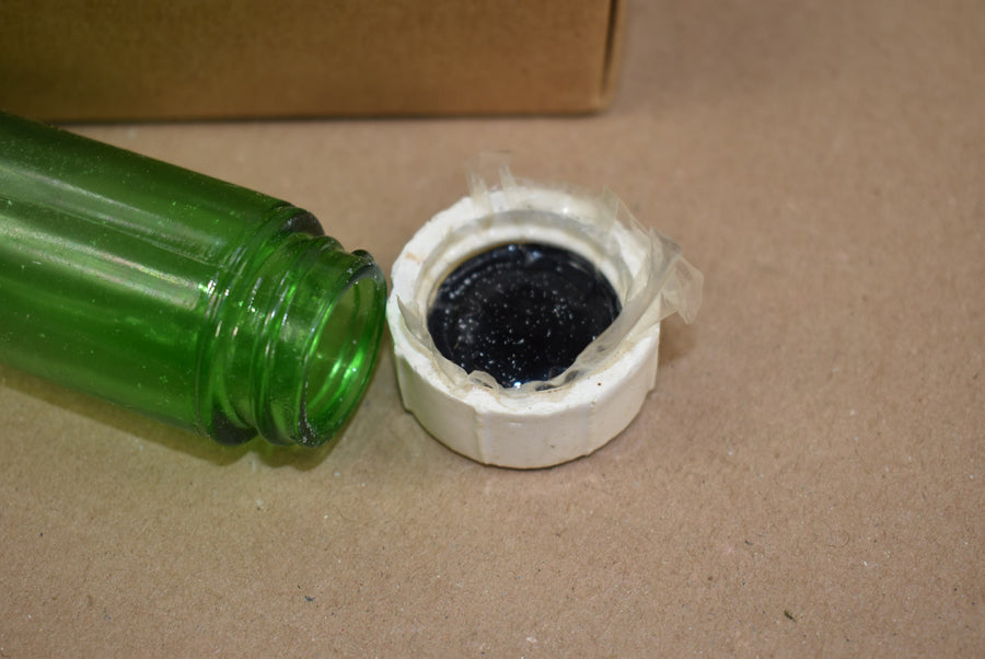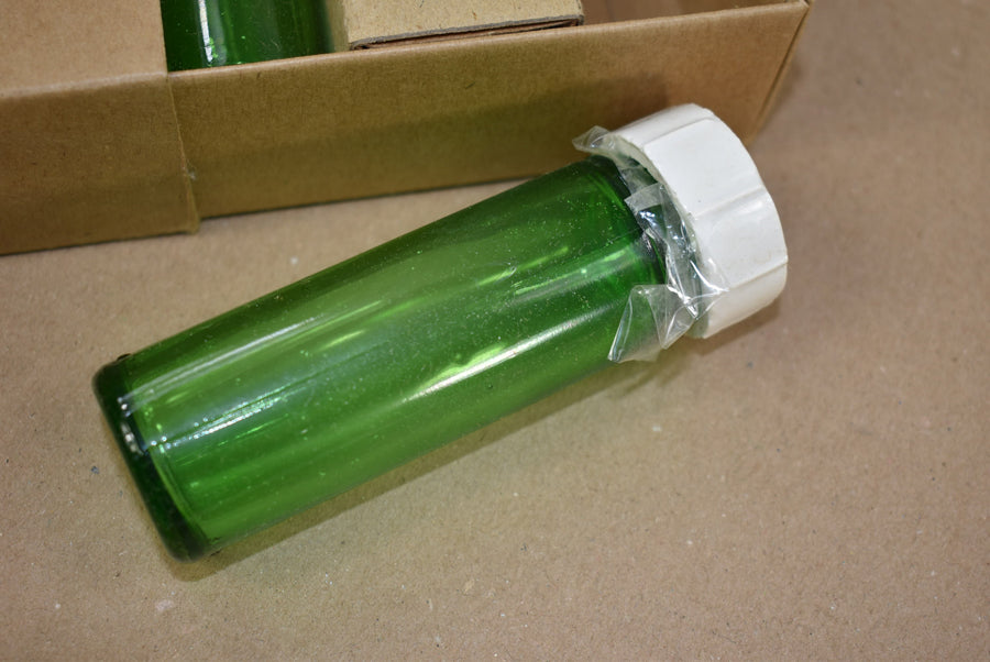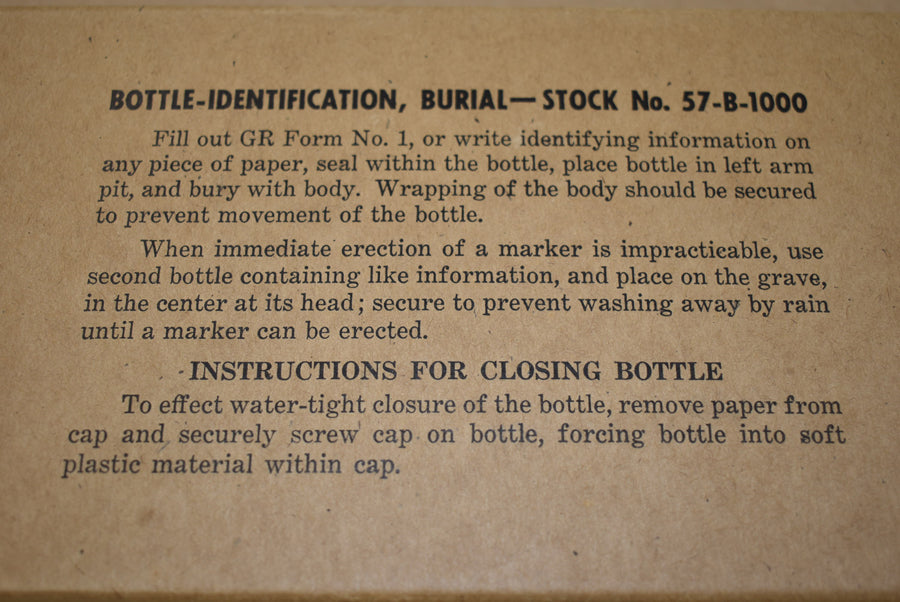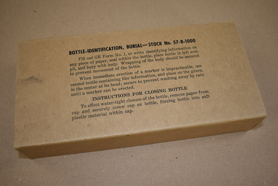 Burial bottles. Full box containing six small green bottles. These were used for paper to identify the soldier and buried with the body.