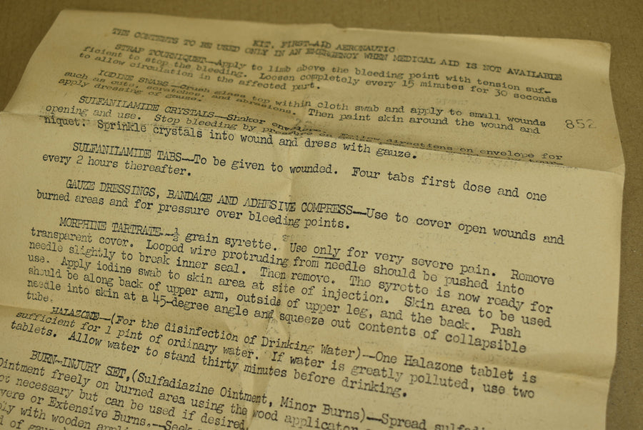 Aeronautic First Aid kit leaflet that sums up the contents of the pouch. Folded as usual to fit the kit. Often missing from the kit.