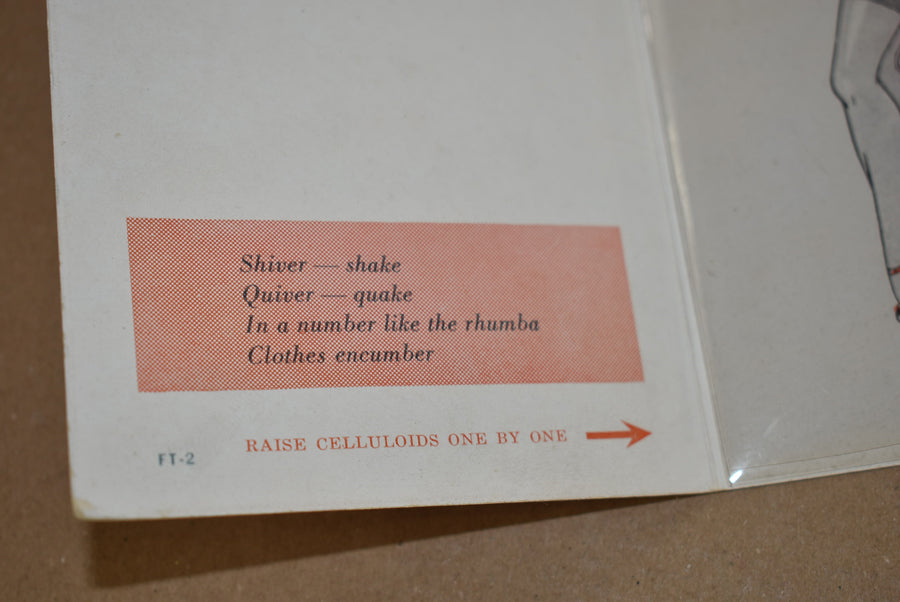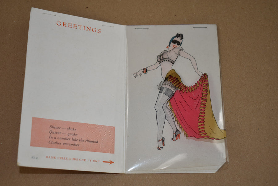 Greetings card with Rhumba dancer undressing as the celluloid sheets are flipped over. Cpyright dated 1940.