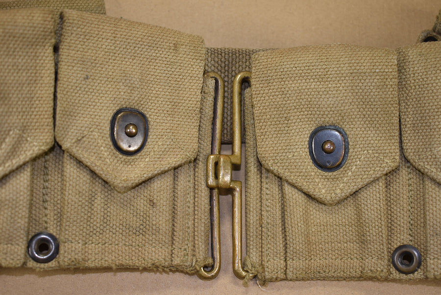 Ceinturon cartouchière. Toutes les sangles intérieures sont présentes et toutes les fermetures sont fonctionnelles. La date est peu visible, mais il semblerait qu'il s'agisse de 1942. Cela coïncide avec la quincaillerie entièrement en laiton.La ceinture est en bon état d'usage.