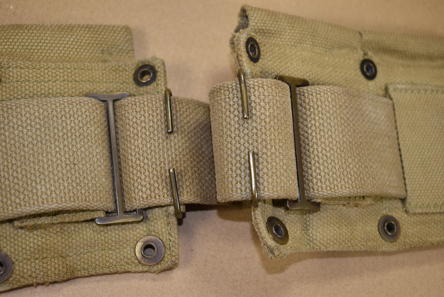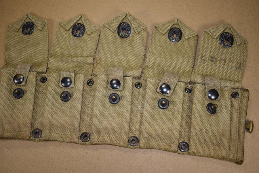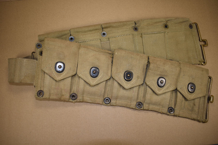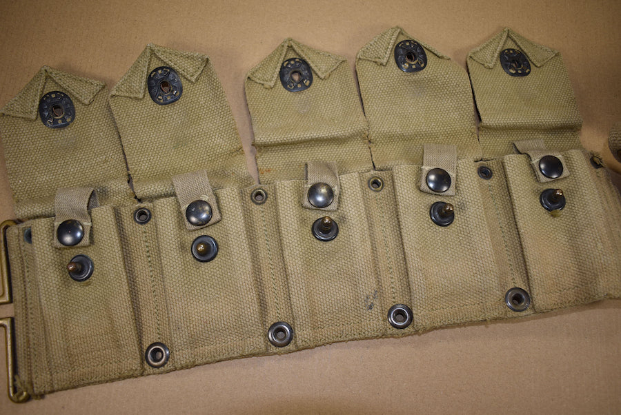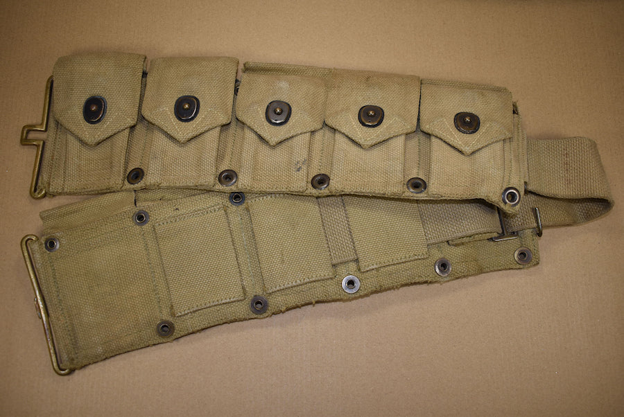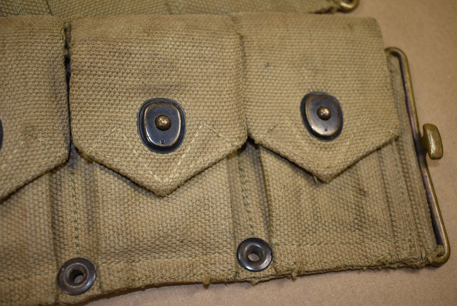 Cartridge belt. All interior straps present and all snaps are functional. The date is quite faint but seems to be 1942. This matches with the all brass hardware. The belt is in nicely used condition.