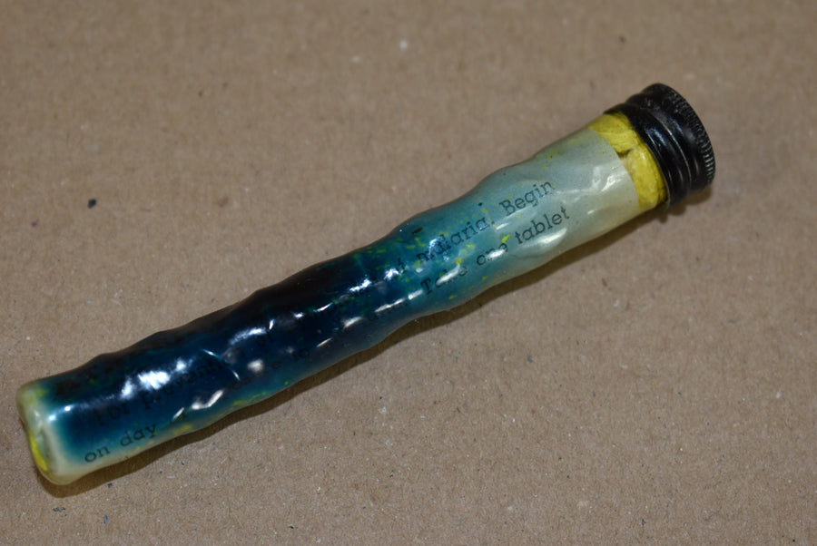 Atabrine tablets in small plastic tube. The tube is a bit misinformed and discoloured. As found in the E-17 survival kit.