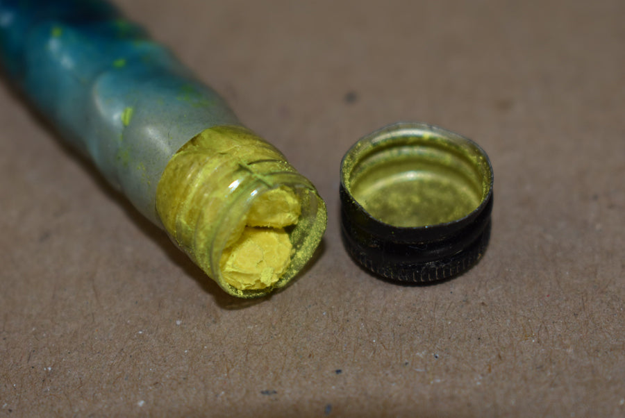 Comprimés de Atabrine dans un petit tube en plastique. Le tube est un peu mal informé et décoloré. Comme ceux trouvés dans le kit de survie E-17.