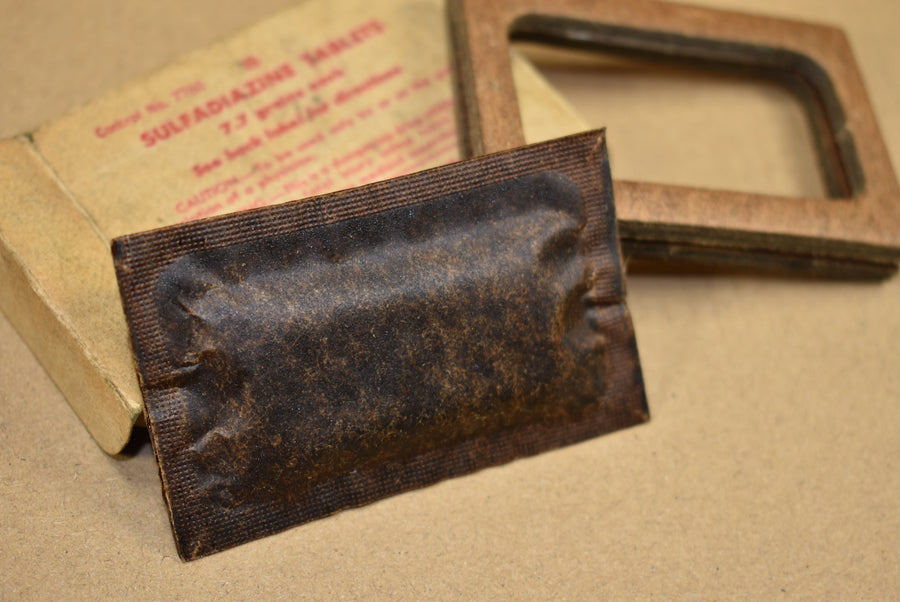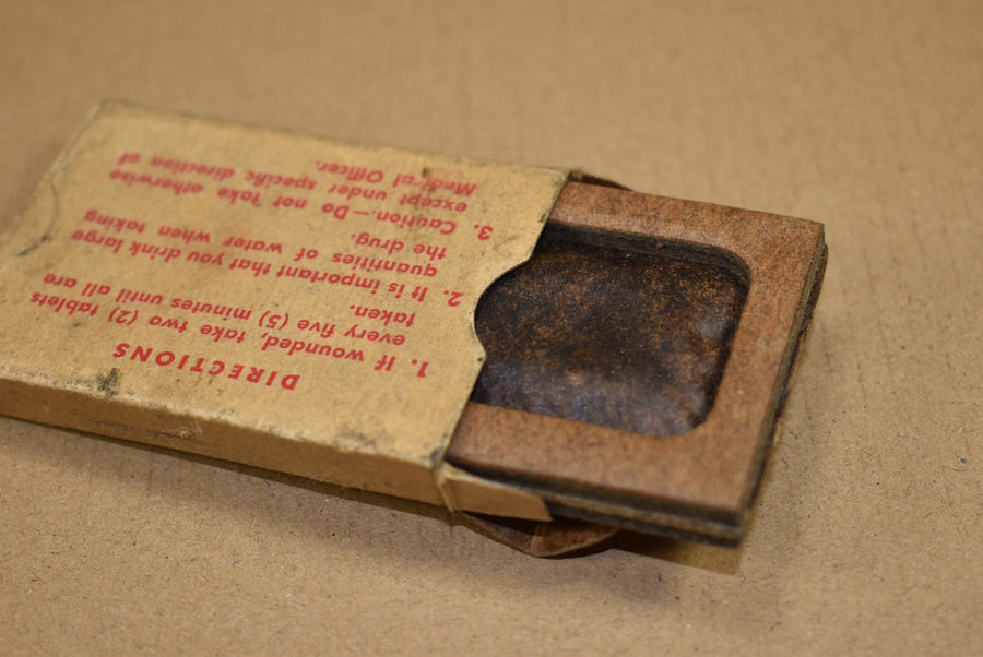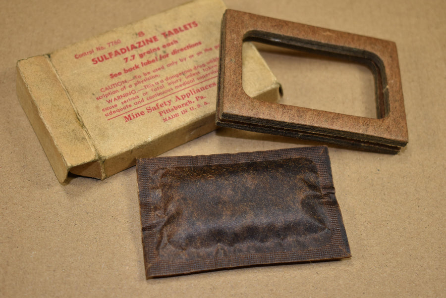 Sulfadiazine, wound tablets. Medical Item nr. 9120400. Small box with cardboard frame that holds a bituminize paper wrapper with eight tablets. This is the early type packaging, later replaced by the packages with Kraft paper wrapper. Produced by Mine Safety Appliances Co. The packages were carried in the First Aid pouch by medical personnel. These boxes are very hard to find, especially the MSA ones.