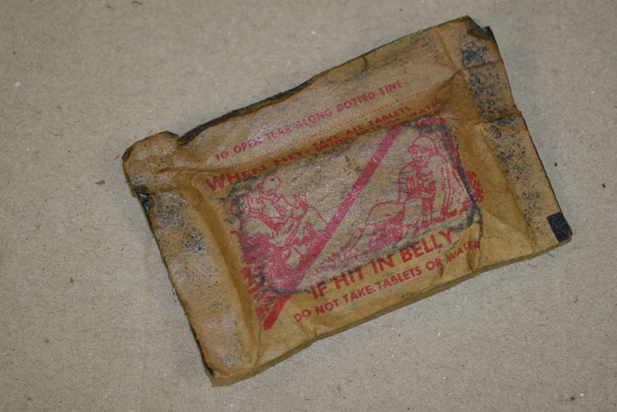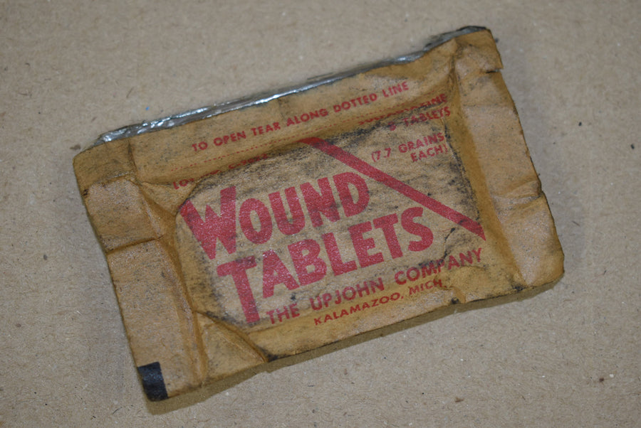 Wound tablets, Up John. Bituminize paper wrapper with aluminum lining that contains a plastic holder with eight sulfadiazine wound tablets. Produced by The Up John Company. This is the version with graphics. These packages were carried by Infantry and Paratroopers in the First Aid pouch. Medics had these too. These packages are hard to find and this one is perfect!