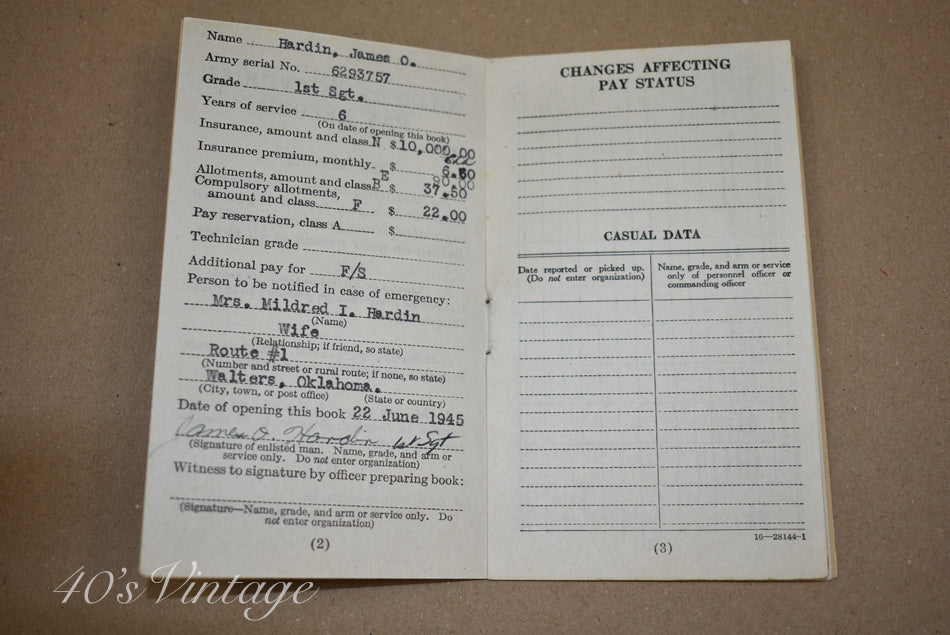 Soldier's Individual Pay Record. It belonged to 1st Sergeant James O. Hardin.