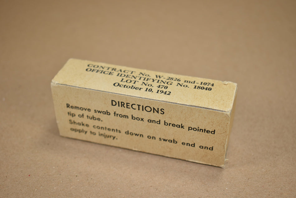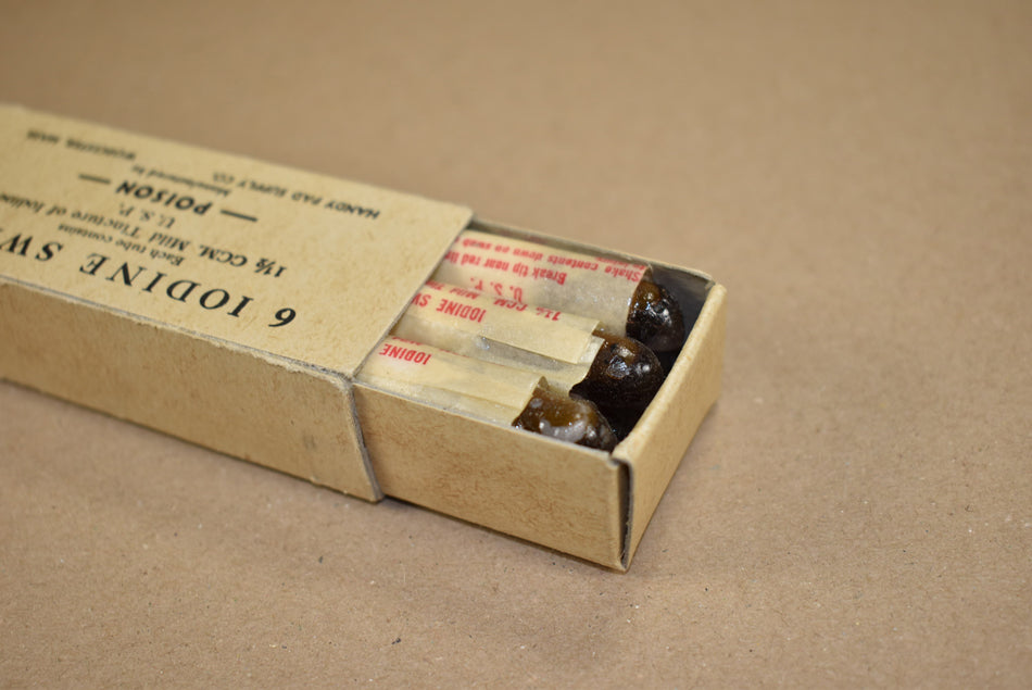 Cardboard box with six Iodine swabs. 1942 dated.