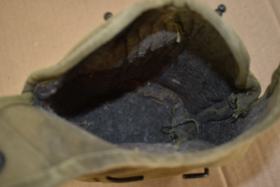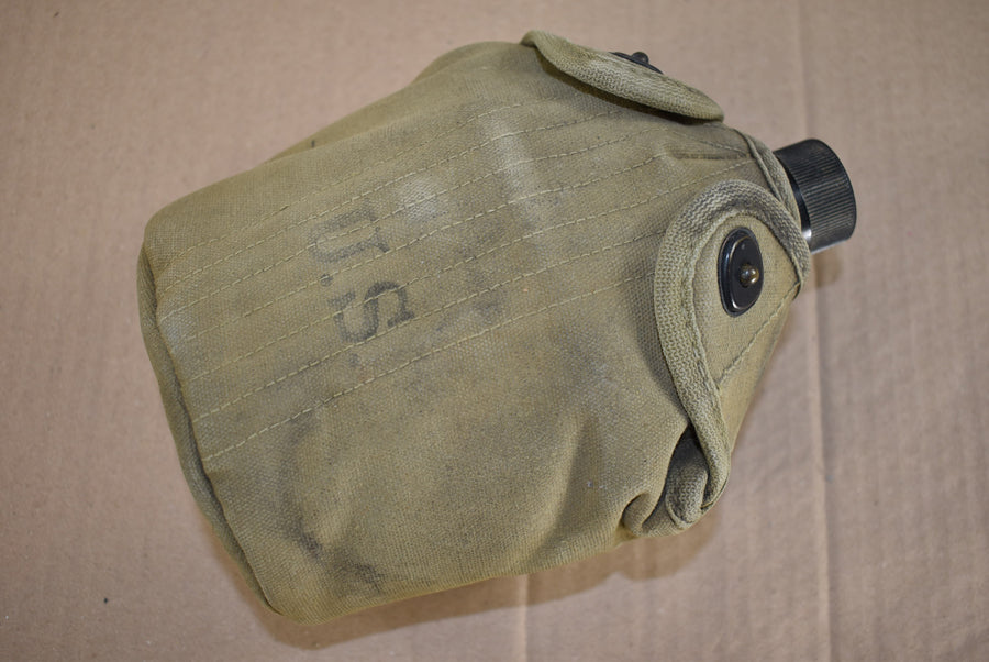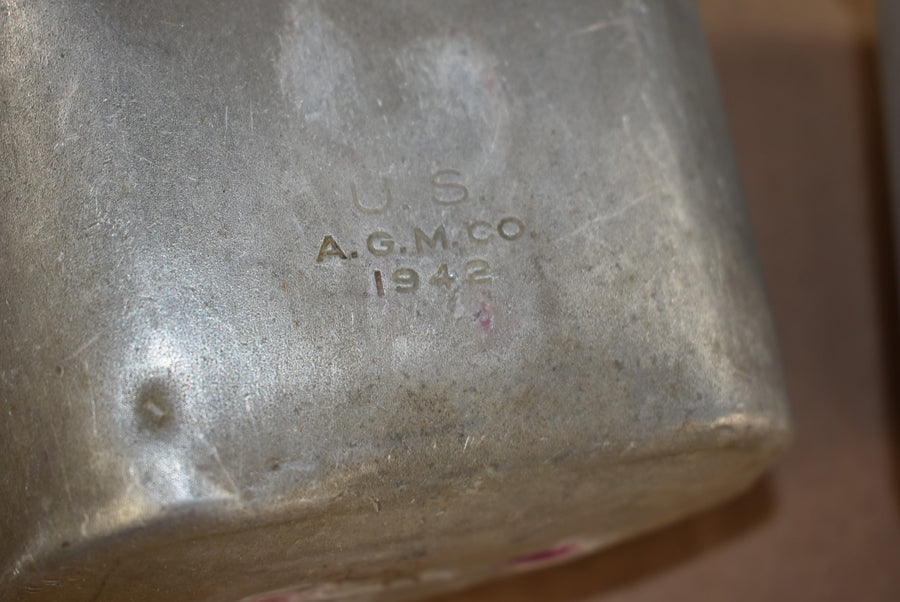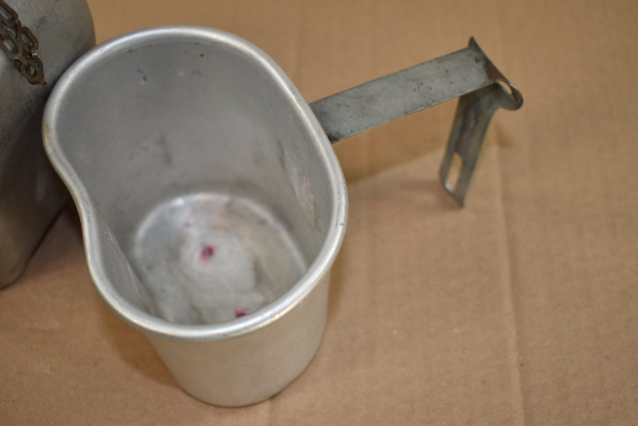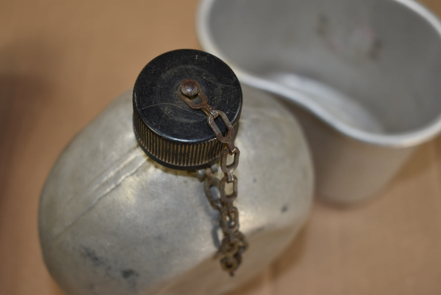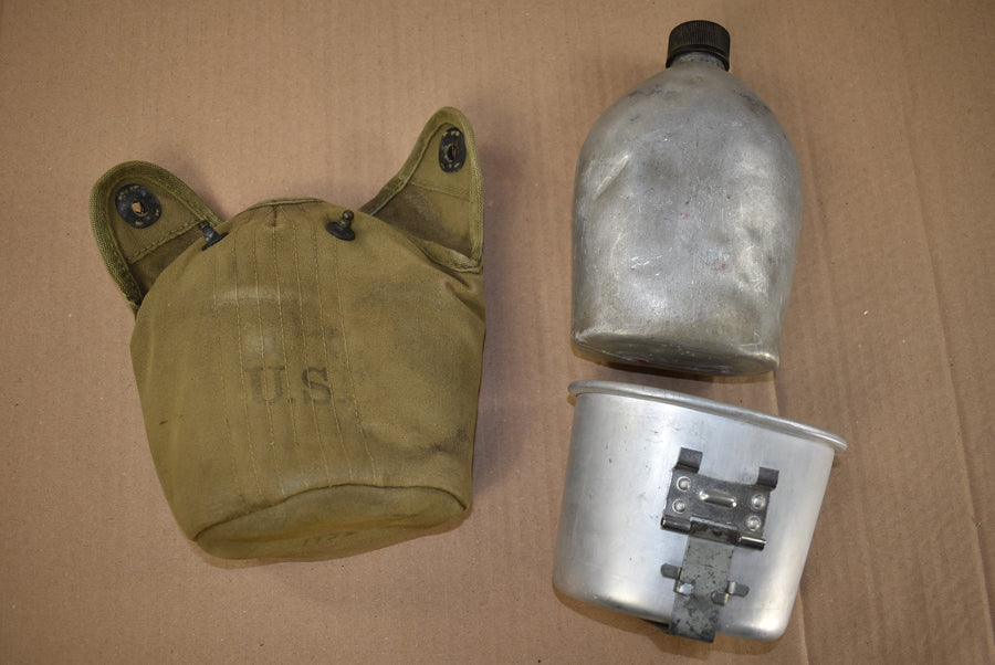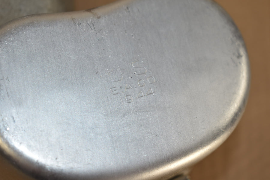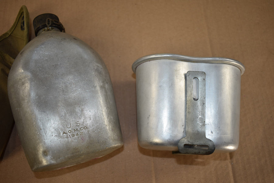 Canteen, complete. Consisting of a 1942 dated aluminum bottle with flat cap, 1944 dated aluminum cup and 1943 dated cover. Nice set!