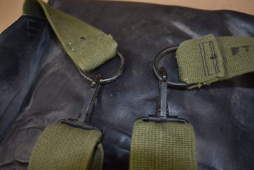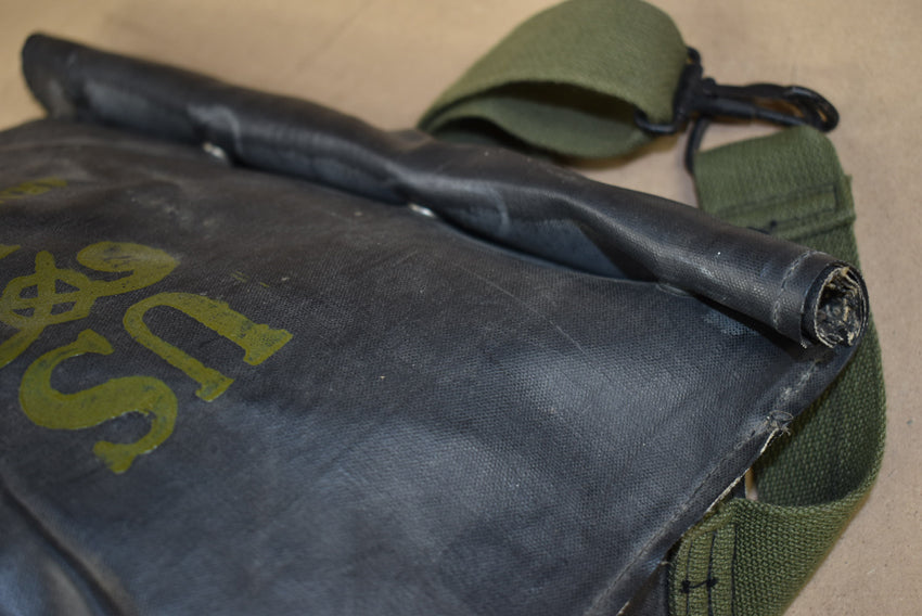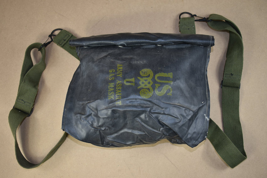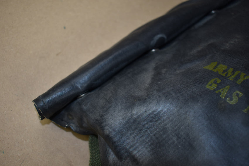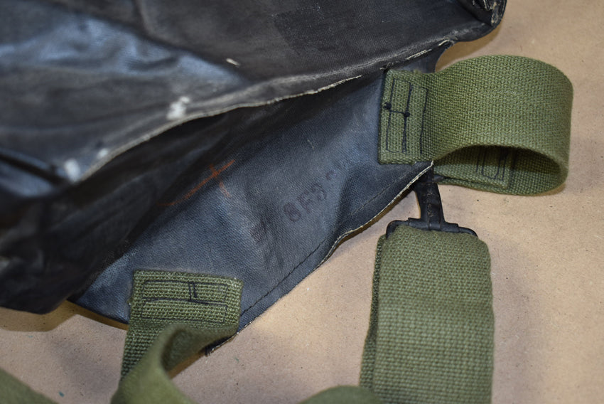 M7 rubber assault gasmask bag. As used by first wave amphibious units and paratroopers during D Day. With 4 snap fastener closure and super nice yellow print. The hardware is very nice. Bag only, no gasmask present!