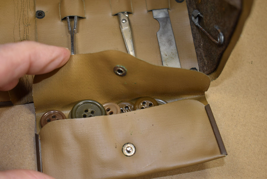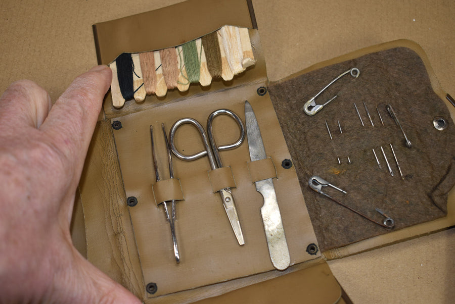 Kit de couture, complète. Pochette en similicuir avec sceau de l'armée. Elle contient une pince à épiler, des ciseaux, une lime à ongles, du fil, des boutons, des aiguilles et des épingles de sûreté. Idéale pour la décoration, le rangement dans une malle ou pour les reconstitutions historiques.
