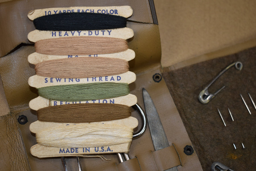 Sewing kit, complete. Leatherette pouch with Army seal. It contains tweezers, scissors, nail file, thread, buttons, needles and safety pins. Nice for display, footlocker or of use during reenactment.