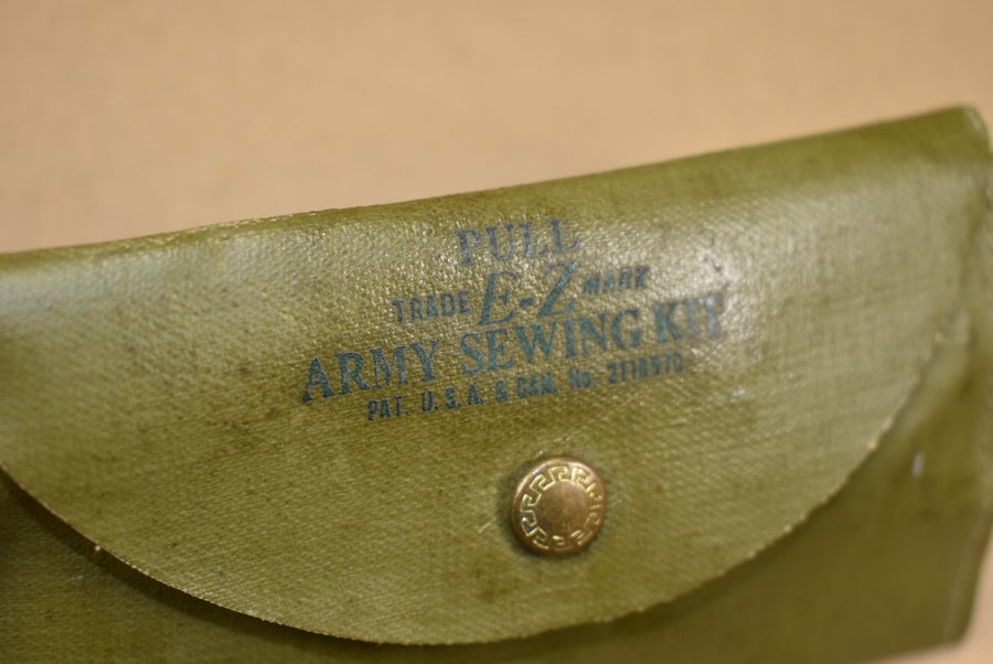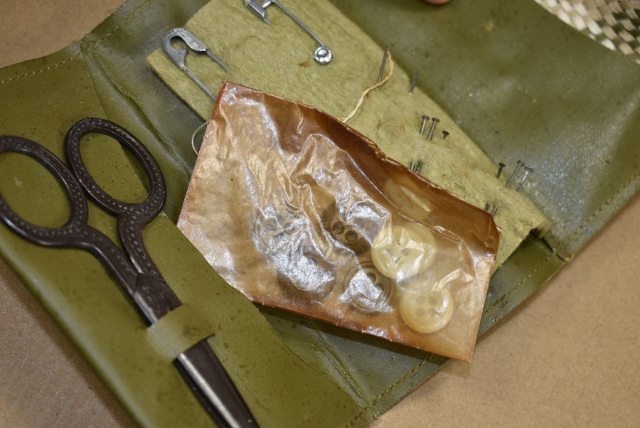 Kit de couture Army, complète. Elle contient des ciseaux, du fil EZ Pull, des boutons, des aiguilles et des épingles de sûreté. Idéale pour la décoration, le rangement dans une malle ou pour les reconstitutions historiques.