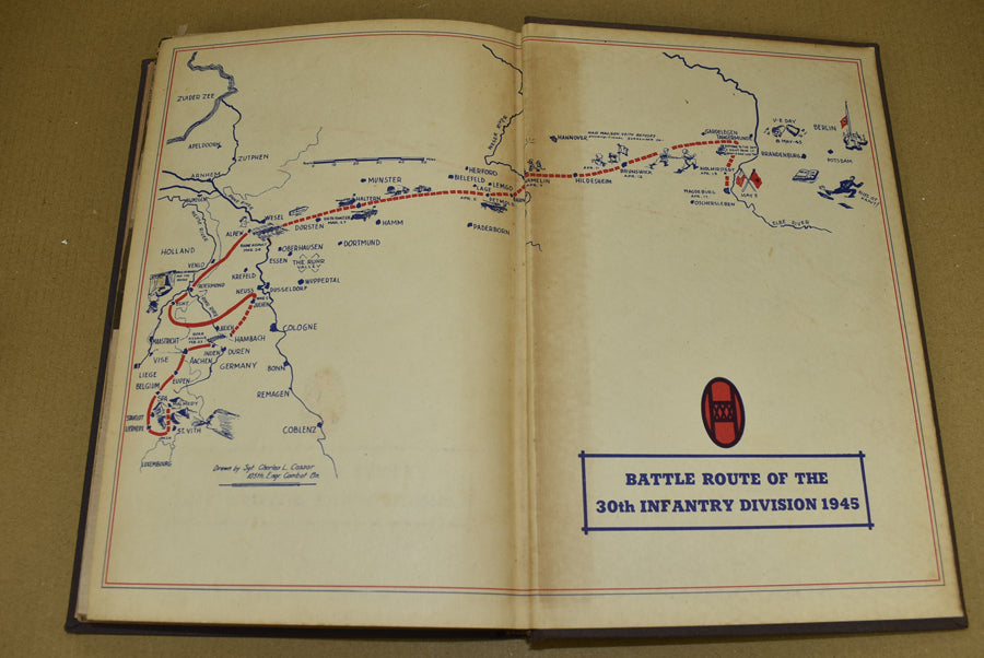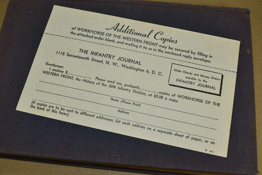30th Division book 'Work horse of the Western front'. This is the official 30th Division history book that was printed in 1946. This hardcover book contains 356 pages with many maps plus an additional photo section of many pages in the back. This is the hard to find original version, not a reprint. Comes with an original form to order more copies which was in the book.