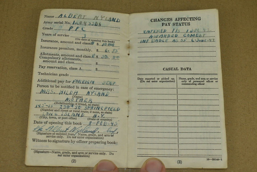 Soldier's Individual Pay Record. It belonged to PFC Albert Nyland, ASN 12043303 Nyland enlisted on January 22, 1942. He served in the ETO with Company C of the 5th Ranger Battalion. The unit landed with the 2nd wave on Omaha Beach. Nyland's name is in the 5th Ranger booklet 'Lead the way, Rangers' with the Enlisted Men of C Company. Nyland received a Bronze Star medal and earned the Combat Infantry Badge on June 6, 1944. Ranger Battalion items are extremely rare and hardly ever offered for sale.