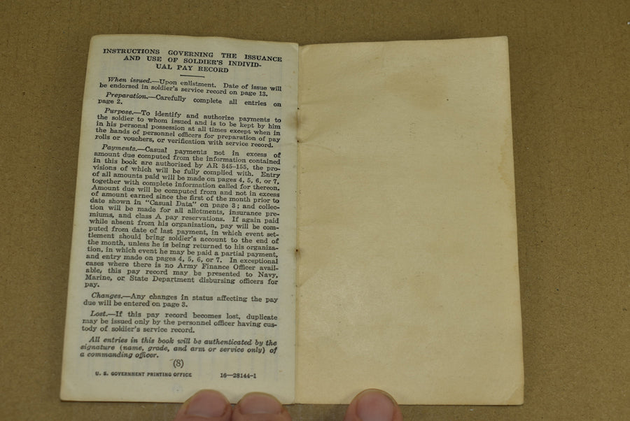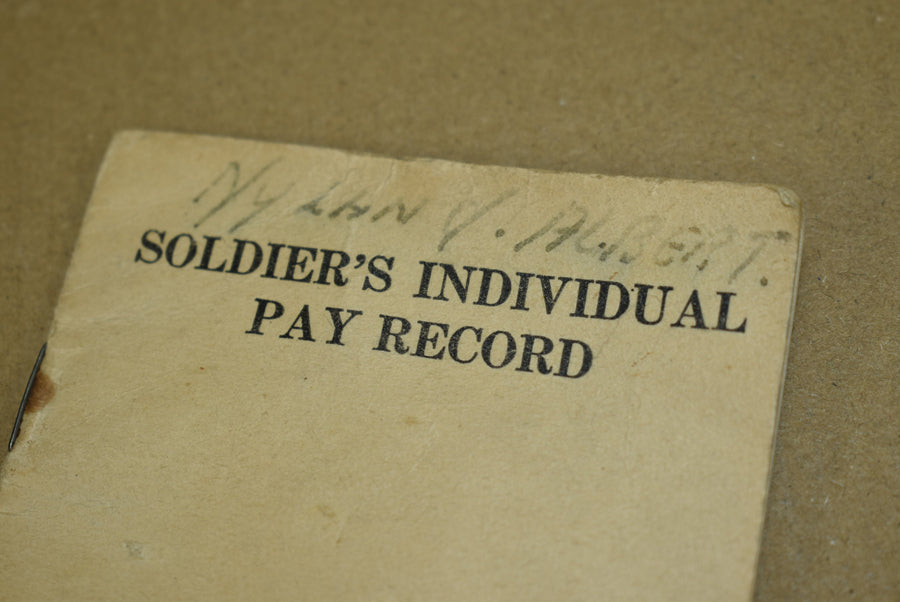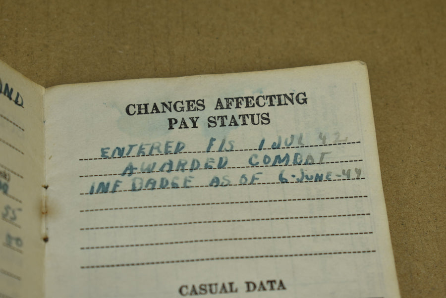 Livret de paie individuel du soldat. Elle appartenait au soldat de première classe Albert Nyland, matricule 12043303. Nyland s'est engagé le 22 janvier 1942. Il a servi en Europe au sein de la compagnie C du 5e bataillon de Rangers. Son unité a débarqué lors de la deuxième vague sur la plage d'Omaha. Le nom de Nyland figure dans le livret du 5e bataillon de Rangers intitulé 'Lead the way, Rangers' (Ouvrez la voie, Rangers), avec les hommes de troupe de la compagnie C. Nyland a reçu la Bronze Star et l'insigne d'infanterie de combat le 6 juin 1944. Les objets du bataillon de Rangers sont extrêmement rares et sont très rarement mis en vente.