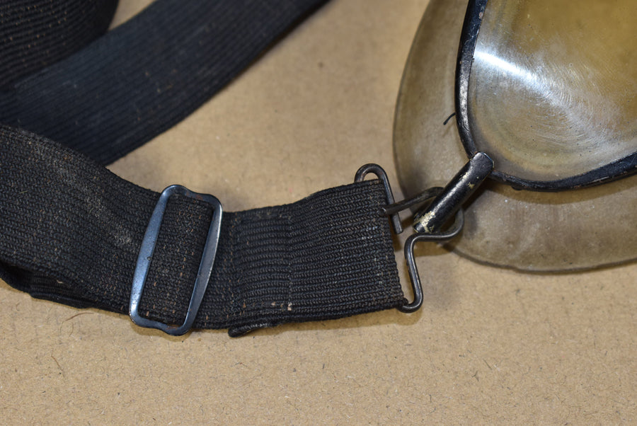Lunettes Skyway Chas. Fisher. Utilisées par les équipages aériens, les équipages de véhicules blindés et les motocyclistes. La partie supérieure est marquée Skyway et la monture est en métal peint en noir. Livrées avec leurs coussinets en mousse d'origine en deux parties et leur élastique.