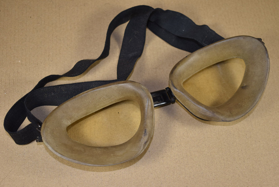 Chas. Fisher Skyway goggles. As used by aircrew, armored vehicle crews and motorcyclists. The bridge section is marked Skyway and the frames are black painted metal. With it original two piece foam cushions and elastic band.