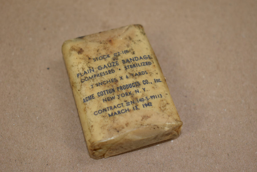 Plain pauze bandage. 2 Inch, 6 yards. Packaged in waxed paper and 1942 dated. NAVY contract, Stock Nr. 2-105.