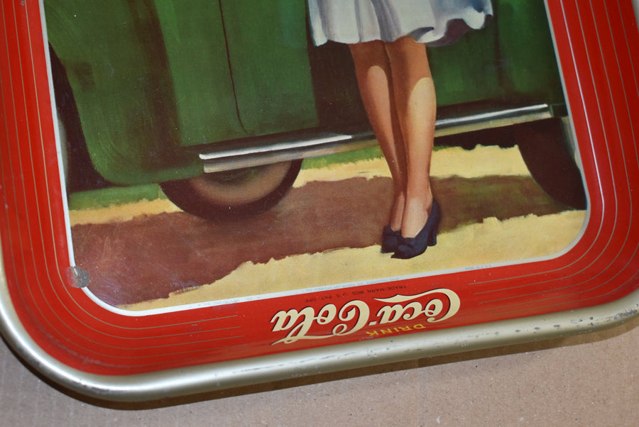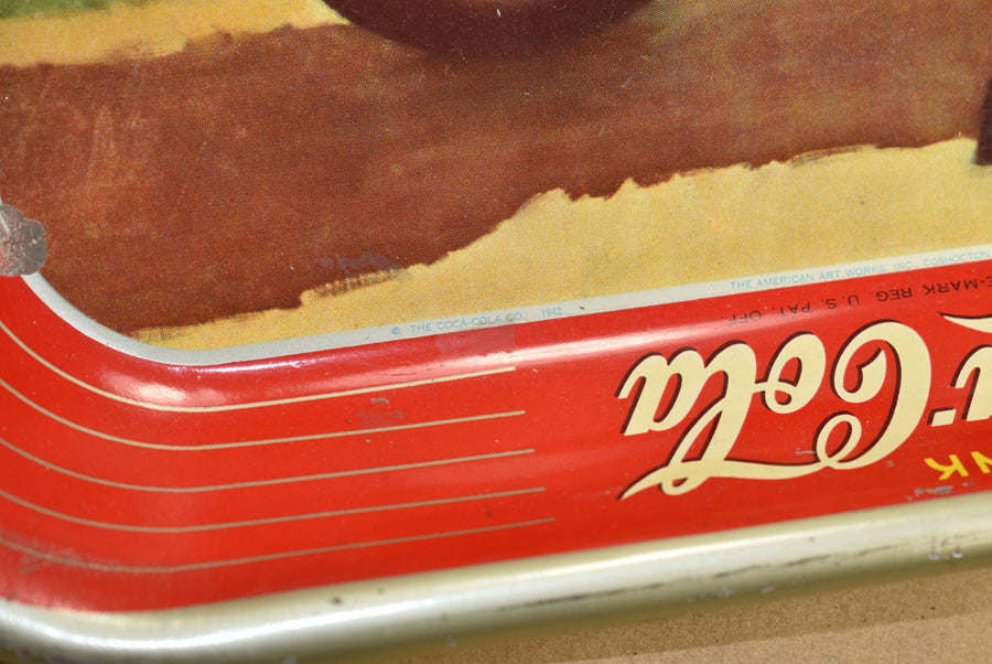 Plateau en acier Coca Cola. Coca Cola propose un nouveau design chaque année. Il s'agit du dessin de 1942. Il est daté sur l'étroite bande argentée au bas de l'image. La production de ces plateaux s'est arrêtée après 1942 lorsque tout l'acier est allé à l'industrie de guerre. Le plateau est en grande forme avec des couleurs vibrantes. Belle pièce de guerre pour l'affichage qui ajoute de la couleur à la collection.