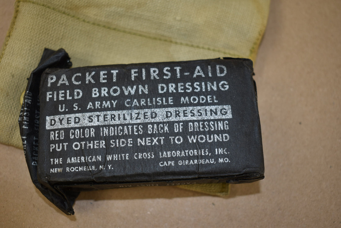 Pochette à pansement M-1910 avec doubles boutons-pression. Daté de 1942. Complet avec First Aid dressing.