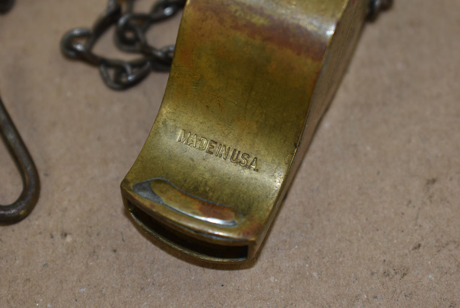 Brass whistle with correct chain and hook. Marked 'Military'. and 'Made in USA'. As used by drill sergeants and Military Police.
