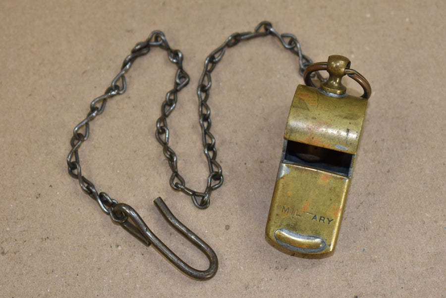 Sifflet en laiton avec chaîne et crochet adaptés. Marqué 'Military' et 'Made in USA'. Utilisé par les sergents instructeurs et la police militaire.