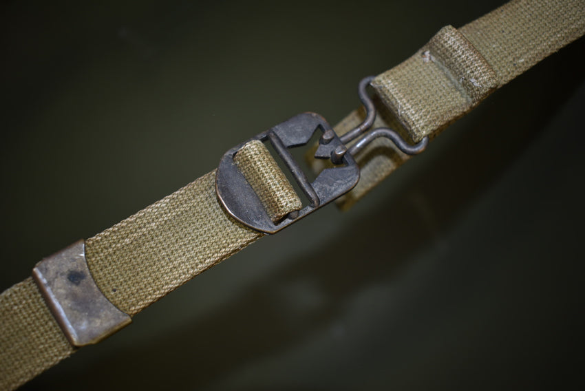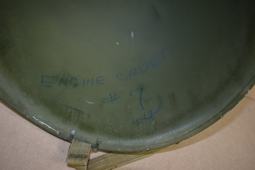 McCord M-1 helmet with fixed loops and front seam. The heatstamp is 195B. It has its original textured paint and OD3 chinstraps with early type brass buckle and hook The helmet has white markings which are unknown until now. There is also some writing on the inside.
