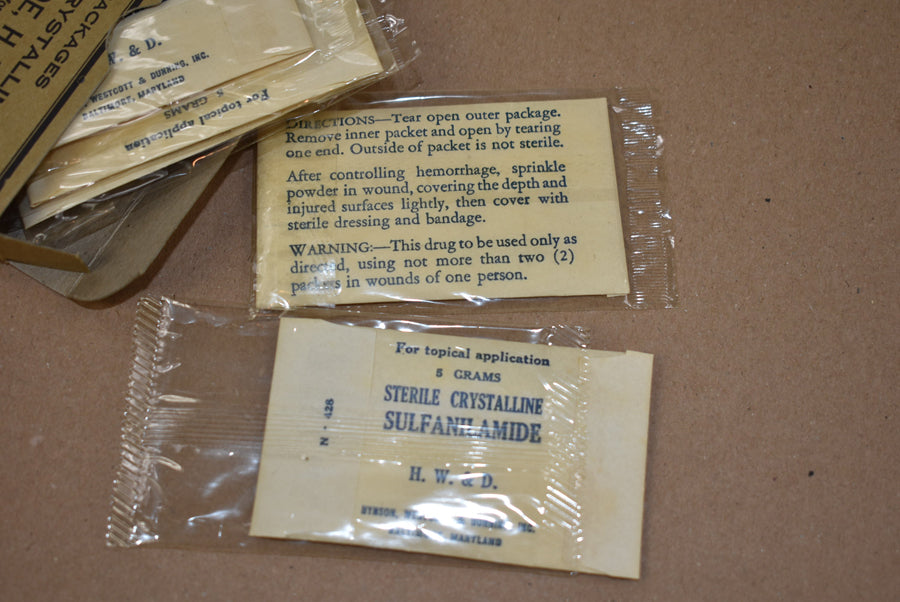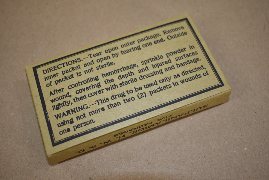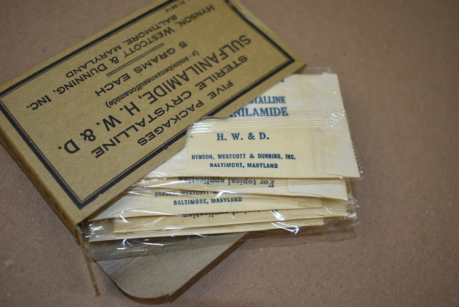 Sulfanilamide. Boîte complète contenant cinq paquets. Fabriqué par Hynson, Westcott & Dunning Inc. Numéro de stock 91211.