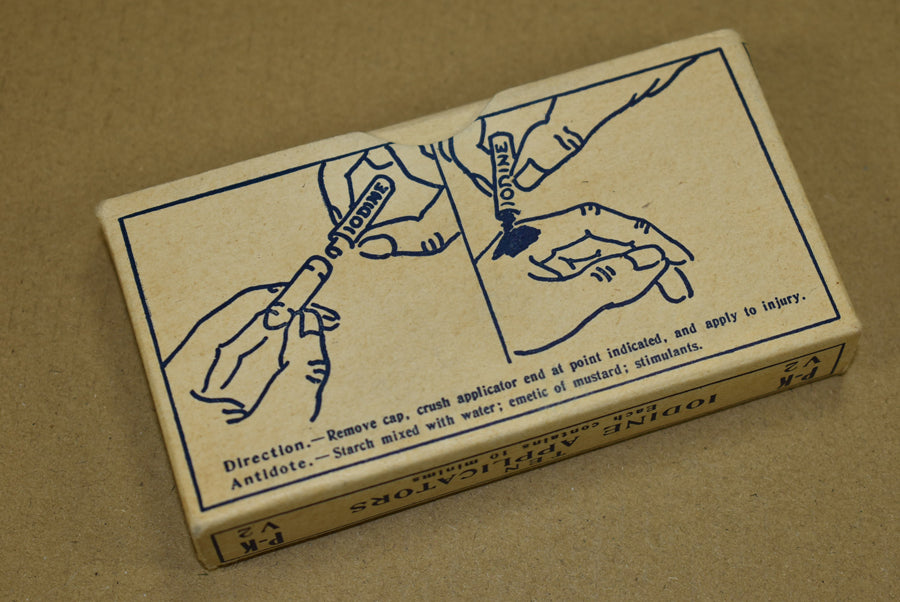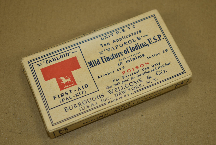 Iodine swabs in cardboard box. Full box. Produced by Burroughs Wellcome & Co. As found in various First Aid kits and used by medics.